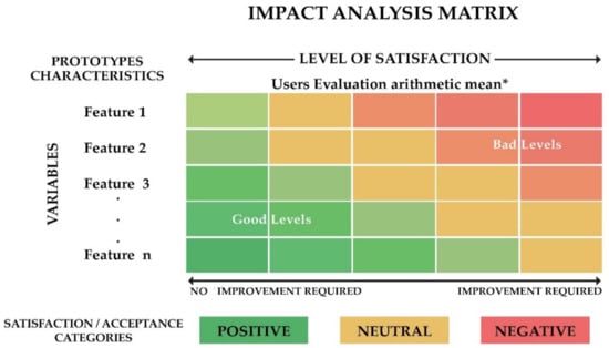 The Probability/Impact (P/I) matrix is a tool used to determine the risks of a project that need detailed response plans. This matrix combines the probability and impact scores of the individual risks of the project and then ranks or prioritizes them for their easy handling. Based on the principles of the P/I matrix, a matrix for the feasibility impact assessment is proposed. As shown in Figure 3, the proposed tool identifies different trends or visible signs of change in a simple way, thanks to its visual faculties [51].
