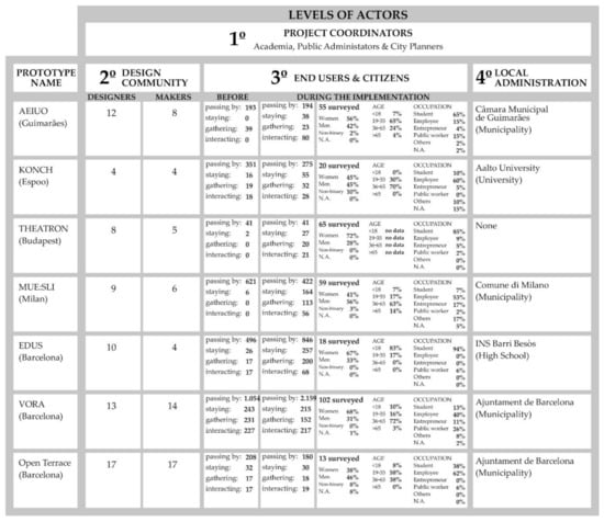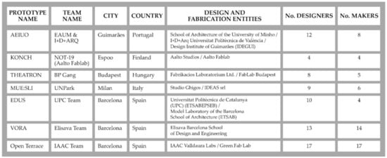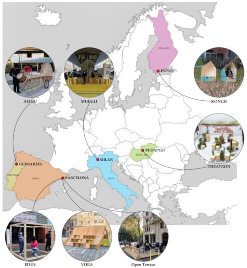 The call received twenty-three proposals, and after a selection process, four teams from four different countries were selected. The three teams belonging to the project partners (UPC, ELISAVA, and IAAC) joined the four selected teams. These seven design teams built a prototype in five different European cities (see Figure 4).