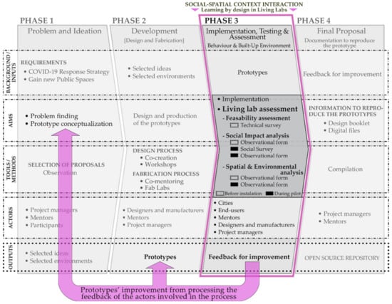 To assess urban design, this study proposes a new model derived from the implementation of ULL, which includes a specific assessment phase during the implementation of temporary prototypes. This investigation indicates that using prototyping in public spaces could create the opportunity to assess the impact that these elements have on society and thus the opportunity to incorporate users’ inputs in the urban design itself. The proposed model aims to track the whole process and presents a new approach that contemplates the overlaps among phases used in other living labs [6], a feature that reinforces the intervention of users in the design and development of urban elements. These overlaps are mainly thought to directly intervene in prototyping, as a testing process that is directly implemented in public spaces.