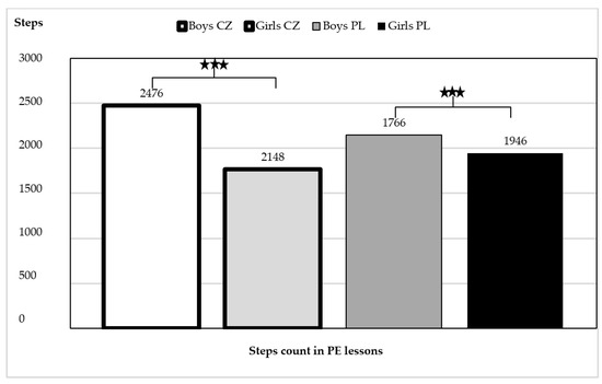 Comparison of the step count/PE lesson (45 min) among Czech (CZ) and Polish (PL) boys and girls; statistical significance of the differences: *** p < 0.001.