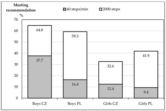 Meeting the recommendation of 2000 steps and 60 steps/minute in the PE lessons (45 min) of Czech (CZ) and Polish (PL) boys and girls.