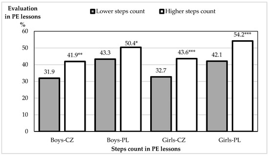 Czech (χ2 = 9.63, p = 0.002; r = 0.099) and Polish (χ2 = 4.62, p = 0.032; r = 0.066) boys, and Czech (χ2 = 14.21, p < 0.001; r = 0.110) and Polish (χ2 = 15.35, p < 0.001; r = 0.119) girls who showed a higher step count in their PE lessons reported a more positive assessment of PE than did their peers with a lower step count (Figure 3).