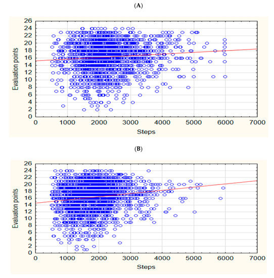 Furthermore, the association between the individual step count and the PE lesson evaluation confirmed the association group, but on a very low level of statistical significance in both boys (rs = 0.087) and girls (rs = 0.181) (Figure 4).