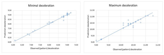 Figure 16 is a graphical representation of the correlation between the predictions and the observed deceleration values (minimum values, maximum values, median). The correlation for the minimum deceleration value is 0.9774, for the maximum value 0.8831 and for the median deceleration 0.9055. The lower values of these correlations are given by the smaller scope of the training set.