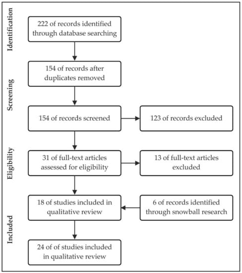 The initial search via the “Web of Science” and “Science Direct” yields 222 potentially relevant articles. To select articles for systematic review, a four-step process is followed [46,48]. A summary is given in Figure 1. In the first step (identification), the duplicate papers, as well as the papers not written in English and the non-peer-reviewed papers, are excluded. After this step, 154 articles remain. For the screening step, I rely on the title, the keywords, and the abstract to identify papers that have a focus on at least one of the five survival criteria related to PCT. While 31 papers have such a focus, 123 are excluded from the review. For the remaining 31 papers, eligibility is assessed by studying their full text. A standardized framework is used to collect information about the bibliography and the methods (qualitative or quantitative) as well as the survival criteria addressed in an article (see Appendix A.1. Framework for Data Collection). To be relevant to this review, an article must address at least one of the five survival criteria. The evaluation of the criteria must be part of the research, which excludes articles that mention criteria only in passing and do not investigate them systematically. The eligibility step excludes 13 articles because they do not make any statements about PCT with regard to the survival criteria. The final review thus contains 18 articles, however, following Kundu et al. [46] (p. 3) an additional snowball procedure is used to find articles that may be overlooked in common databases. The snowball search is performed during the full-text review of the 31 articles that reach the third stage. I consider the cited articles that explicitly refer to one or more survival criteria. The articles identified by the snowball search are reviewed again. Six more articles can be identified, so 24 articles are used for the analysis (The list of articles used for the review can be found in Appendix A see Table A1. List of articles used).