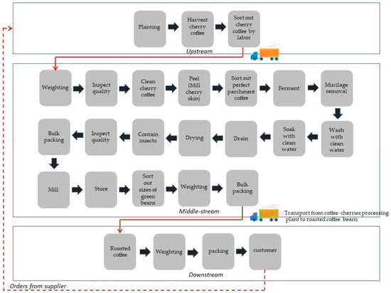 Coffee is popular in the modern world. It is considered an important consumer product and economic crop that creates value for the food industry in domestic and export markets [30,31]. Typical coffee supply chain from utmost upstream to downstream customer is shown in Figure 2. When analyzing the process, it was found that the cost of coffee production in Thailand from plantings to the roasted beans coffee is relatively high when compared with coffee-making from neighboring countries [32]. The major problems such as high cultivation costs, lack of cultivation standards to produce high-quality coffee, and unplanned incoming material (coffee cherry) that led to continuous losses and disappearing customer confidence were identified [33,34,35].