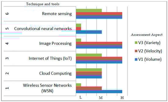 To highlight the techniques and tools applied in big data identification in agricultural practices, six groups of techniques were found extensively from the previous studies. Those research works were assessed based on the three aspects: volume (V1), velocity (V2), and variety (V3) with the level of high, medium, and low. The primary result is shown in Figure 4.