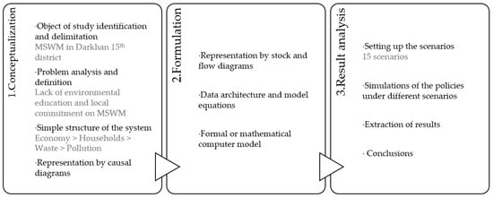 The construction process of a system dynamics model is systematized, comprising the conceptualization, formulation, and result analysis of the model. Thus, following the common steps [61,62], we will construct our model, named DARKHAN-15 (DARKHAN-15 refers to 15th ger district of Darkhan city), in which we will simulate MSWM policies. The first step, conceptualization, is essential for the successful functioning of the model, as it involves the understanding of the system and its translation into causal diagrams of relationships, on which the model will be constructed. This is followed by the formulation phase, representing its relationships as a stock and flow diagram, later integrated into simulation software with the model database, to form the mathematical model. This model will be able to simulate the system’s behavior, where the education and infrastructure policies can be applied over a certain period. Lastly, the result analysis phase includes the establishment of the conditions of the different scenarios or alternatives, and their subsequent simulation. The results extracted can be used to draw conclusions and make decisions regarding the policies to be implemented. Figure 2 details the process of building the model using system dynamics.