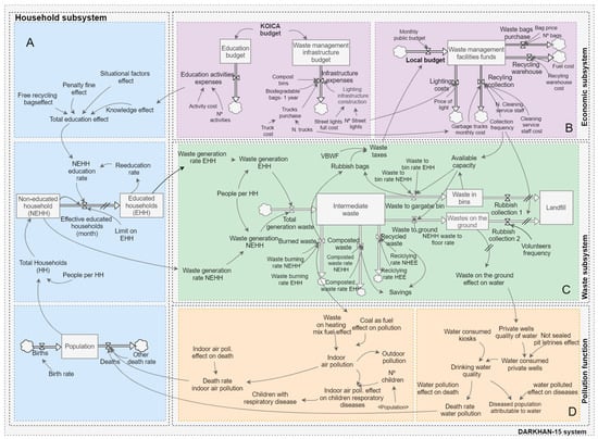 The final step of the conceptualization phase is to establish the cause–effect relationships between the variables of the subsystems and their limits. Elements are progressively added to the structure, identifying the elements that will form our system. This naturally leads to the establishment of system boundaries and feedback loops. After this, causal loop diagrams are translated into stock and flow diagrams through stock, flow, auxiliary variables, and delays. Figure 4 represents the economic, household, waste, and pollution subsystems of the DARKHAN-15 system through a single stock and flow diagram.