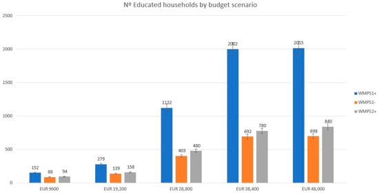 Figure 5 shows the number of educated households out of the total (2480 households) for each of the conditions established. A greater effect is obtained when the conditions of financing, maintenance, and citizen response of the WMPS1+ scenario are fulfilled. However, if these conditions are not created (WMPS1−, WMPS2+), the impact is much smaller. Additionally, a large marginal difference is observed between one scenario and the rest. The larger the budget, the larger the effect of education on total households. However, once we reach budget D (EUR 38,400), we observe that the marginal difference to budget E (EUR 48,000) is not significant. That is, given the larger volume of resources involved, it does not represent a large difference in the number of educated households. It should be remembered that we consider educated households those that, regardless of their level of formal education, are educated in environmental awareness, sustainable development, and proper waste management.