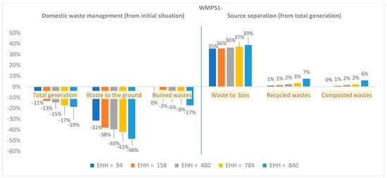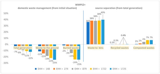 Figure 8. Results of domestic waste management and source separation under scenario WMPS2+ and five different education levels. Source: Own work.- Results for environmental pollution and diseases of the population (Table 2).