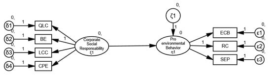 To measure the CSR index, CEMEFI’s instrument was used to obtain the adapted CSR badge as follows: according to the structure, the scale comprised 31 items divided among the four pillars of the CSR through of a five-point Likert-type scale reaching Cronbach’s α = 0.936 for the global scale and values above α < 0.750 for the rest of the scale dimensions. To measure the PEB index, we used the motivation scale to measure proenvironmental behaviour [67] with 13 behaviours evaluated with a five-point Likert scale. Cronbach’s α = 0.771, which is acceptable for social sciences [68]. Cronbach’s alpha tests the reliability of latent variables to confirm good internal consistency of each item on a scale. Table 1 presents the reliability for the latent variables, and each Cronbach’s alpha for the latent variable was above the acceptable value of α = 0.600.