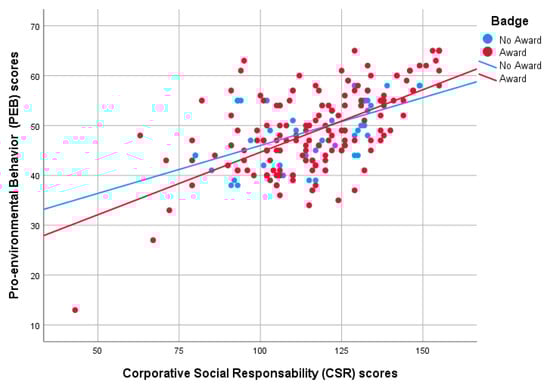 Lastly, overall correlation between CSR and PEB was medium–high; when this correlation was controlled for the badge, for both the badge (rxy = 0.611, p < 0.0001) and no-badge (rxy = 0.510, p < 0.0001) groups, correlations and significance levels were maintained; in the case of companies with the badge, the association was strengthened (Figure 2).