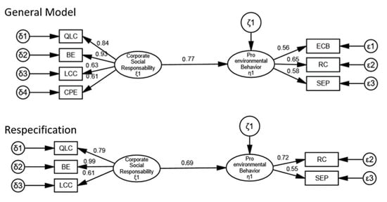 The respecification of the overall model showed a good partial fit. However, the observed variables related to the environmental aspect (CPE of CSR and ECB of PEB) were extracted from the overall model because they had the lowest estimates of standardised regression weights for each measurement model.