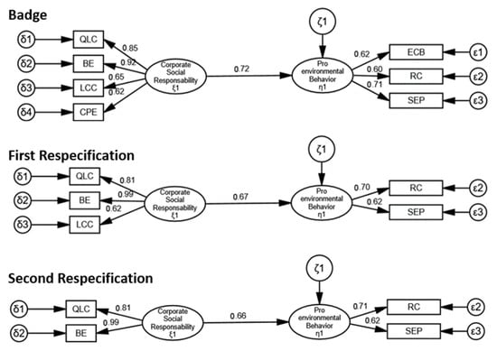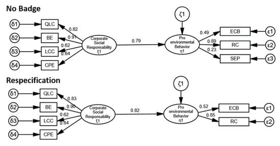 The comparison between the badge and no-badge groups showed important differences because of the respecification of the models for each group. For the badge group, two model respecifications were necessary to present an adequate fit. In this process, a model was defined with two dimensions for CSR (QLC and BE) and two dimensions for PEB (RC and SEP) (Figure 4). The second model respecification for the badge group presented the best fits to the comparison indicators (Table 5).