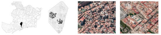 The two city blocks chosen for this study are located in the center and at the southern end of the Raval neighborhood (Figure 1), and both have been categorized as suffering from extreme socio-residential vulnerability [48,49]. These two blocks were selected after searching for areas with clearly different urban contexts according to the following criteria: