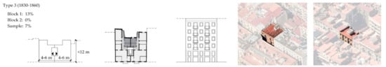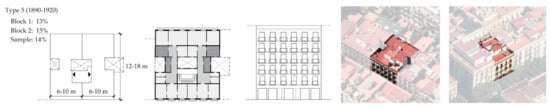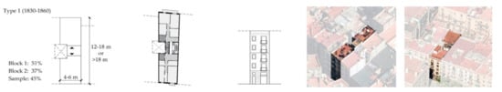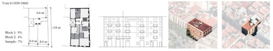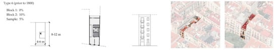 As can be seen in Figure 2, Figure 3, Figure 4, Figure 5, Figure 6, Figure 7, Figure 8 and Figure 9, many buildings from the sample were built as workers’ rental housing around 1860, particularly in block 1. Block 2 is located in one of the first areas of the Raval to be urbanized; as a result, there is a much wider range of building types—this makes our sample much more diverse. Some were built before 1830, others were built as workers’ rental housing from around 1860, and others are bourgeois rental buildings from after 1890. Type 1 (workers’ housing with narrow façades and two apartments per landing) (Figure 2) is the most common in the sample and in both blocks—particularly block 1, where it constitutes over 50% of all dwellings. The next most common type (making up less than 15% of residences) is the bourgeois rental building with an ample façade (Figure 6), a precedent of Barcelona’s Eixample neighborhood [104,118]. Finally, we find a considerable proportion of worker’s rental housing with a narrow façade and only one apartment per landing open to the front and back of the building, abundant in block 2 (Figure 8).