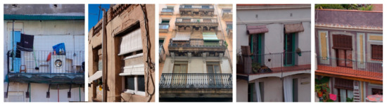 - Cornadó, C.; Vima-Grau, S. Prediagnosi de l’estat de l’edificació residencial a la Barceloneta, Raval Nord i el Born Nord, com àmbits de vulnerabilitat de la ciutat de Barcelona; Ajuntament de Barcelona: Barcelona, Spain, 2018. [Google Scholar]