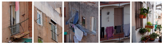 This mixed method includes the following: the analysis of secondary data drawn from maps and statistical databases and the analysis of primary and secondary data from non-invasive fieldwork (direct observations made from the street, from the interior of city blocks, or from entryways, stairwells and rooves). Our main data source is the Cadaster [35], in combination with the statistical data from “Estudi i detecció a la Ciutat de Barcelona d’àmbits de vulnerabilitat socio-residencial” [49], which includes databases provided by the Barcelona City Council as well as data from the Registry of Residents. Maps are taken from the Institut Cartogràfic i Geogràfic de Catalunya (ICGC) [111] and are updated thanks to on-site observations and archival information taken from the Arxiu Municipal de Districte Ciutat Vella [112] and the Arxiu Municipal Contemporani de la Ciutat de Barcelona [113]. Archival research only provides relatively recent interior floorplans for a few cases. For this reason, aspects related to the interior distribution of dwellings that have not been empirically observed are not discussed in this paper. However, the precise visual analysis of a set of fieldwork photographs allowed us to collect additional detailed, qualitative and updated information including aspects related to residents’ relationship with their dwelling spaces [57].