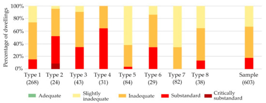 The results of these 43 indicators are given a score from (1)–(6): (1) critically substandard, (2) substandard, (3) inadequate, (4) slightly inadequate, (5) adequate, (6) above adequate. This score allows us to establish an ordinal system for describing each dwelling according to each indicator, which positions the dwelling within the described standards.