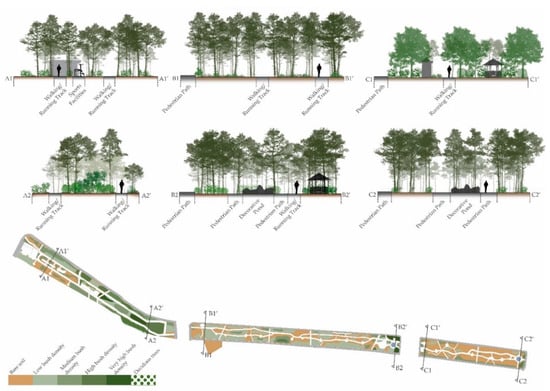Height and density of trees, bushes, and shrubs in Municipality Park (reproduced by researchers based on the Municipality Base Map [66]).