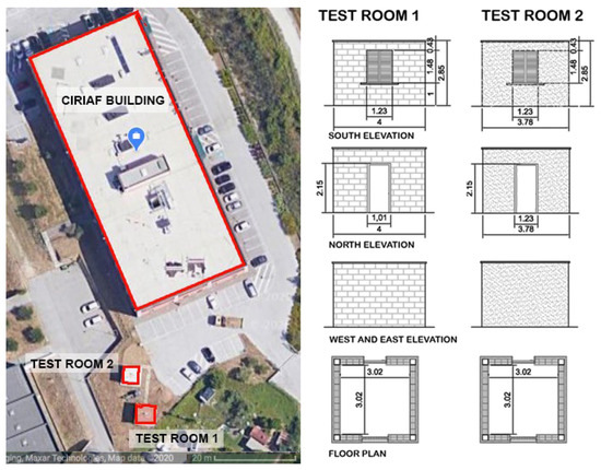 Two prototype buildings, i.e., test-rooms (TR) located at the Engineering Faculty of the University of Perugia (Italy) were monitored and the experimental campaigns’ data were collected (see Figure 2).