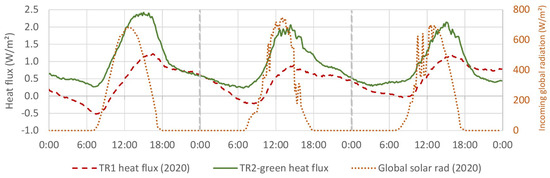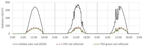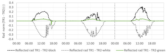 Figure 3 shows the global incoming radiation profile from the weather station and the reflected radiation profiles for TR1 and TR2-green in the 3 selected representative days. As expected, TR2-green is always associated with lower reflected radiation values, while the reflected radiation peak on TR1 is 171 W/m, against a value of 148 W/m in TR2-green. Both peaks were registered on the second day, at 13 h during correspondence to the peak of incoming solar radiation (750 W/m). The mean difference is of 12 W/m higher on TR1, i.e., about 7% of the maximum registered reflected radiation.
