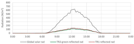 The average results for the selected 25 days, (Figure 4), show peak values of 136 W/m on TR1, and 116 W/m on TR2-green registered at 12:30, corresponding to an average difference of about 8 W/m, i.e., 6% of the maximum registered reflected radiation. TR1 average reflected radiation was 55 W/m, while TR2-green only reached 47 W/m.