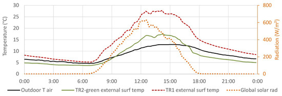 Figure 8 shows the average results, depicting a small reduction in the registered thermal gap. However, a similar behavior is still registered. TR1 average temperature is of 13.8 C, with a peak of 27.3 C, while TR2-green average temperature is 8.2 C, and a maximum temperature of 17.4 C is found at 14:10. The temperature gap reduces to 22.5 C in TR1 and becomes while TR2-green was 13.7 C in TR2-green.
