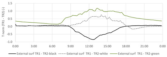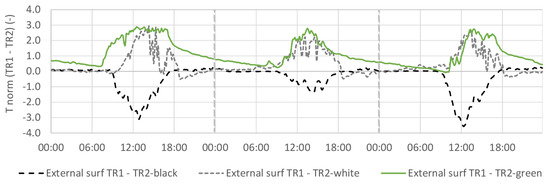 TR1 and TR2 normalized difference on external surface temperature for black, white, and green roofs during 3 days.