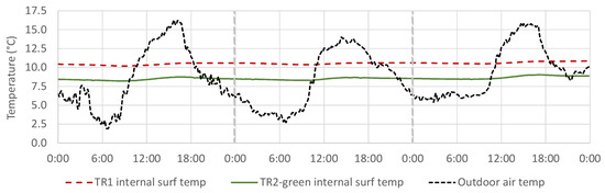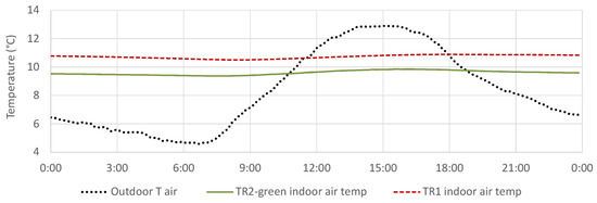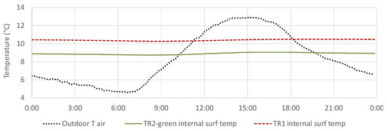 The first step of the analysis was carried out by direct comparison of the monitored data from TR1 and TR2-green under identical boundary conditions, i.e., outdoor climatic conditions and indoor free-floating conditions.