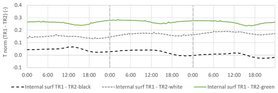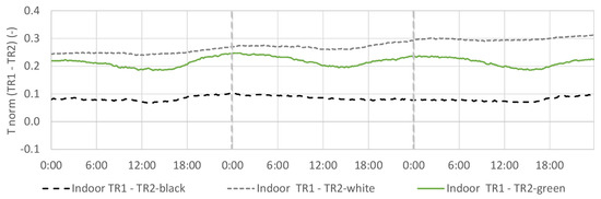 Figure 9 shows the normalized external temperature, the difference observed during the 3 days exhibit TR2-green and TR2-white with lower temperatures than TR1 of about 2.9 on the peaks. TR2-green presented less temperature fluctuations during the day, while the TR2-white had more. TR2-black reached a higher difference on the third day of 3.6 compared to TR1.