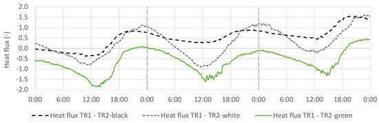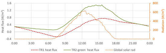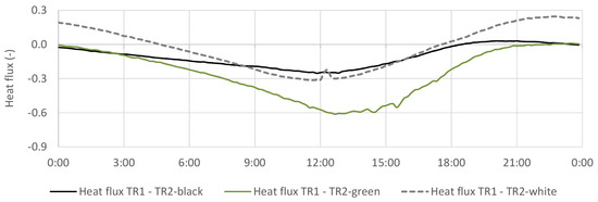 Concerning the solar heat gains through incoming radiation, the reflectance variation between the surfaces affects the buildings’ thermal performance. According to Pisello [36], a red natural clay tile solar reflectance is about 28 to 44%, while a grass-covered area typically is 20%. This difference is observed on the TR1 and TR2 measurements, where TR2-green reflected about 14% less than TR1.