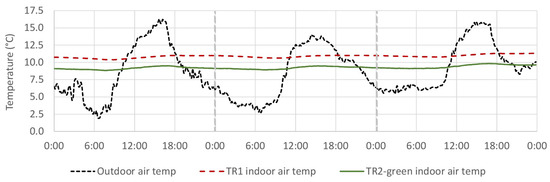 On the 3 days (Figure 7), TR1 average temperature is 16.8 C, with a maximum of 41.3 C, and a minimum of 3.3 C, which is almost double the TR2-green, with average temperature of 8.3 C, maximum of 22.3 C, and minimum 0.8 C.