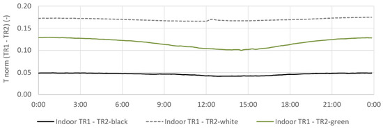 The calculated average from 25-days confirms the behavior. In Figure 6, TR2-white had higher peaks of reflectance compared to TR1, being more responsive to the solar incoming radiation. For TR2-black, it is assumed a typical reflectance value of 4–8% [36]. TR2-black absorbs more of the incoming radiation, with peak value at 12:30.