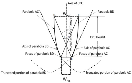 A compound parabolic concentrator usually consists of two separate reflectors having a parabolic shape, which direct the sun rays arriving at the opening facet to the outlet aperture. The right and left sides of the CPC comprise two distinct parabolic curves, with the corners of the PV module placed between the focal points of the two counterparts. The axes of the constituent parabolas are aligned away from the axis of the CPC by an angle known as acceptance half-angle (θa), which defines the angular range through which all radiations arriving at the entrance are received by CPC without maneuvering its position. In the ideal reflector, any ray entering the aperture at angles between ±θa (acceptance half-angle) will be reflected on the PV cells placed at the focus plane of the concentrators. CPCs can be classified as two dimensional or three dimensional. Another classification results due to symmetry, i.e., symmetric and asymmetric CPCs. However, all CPCs originate from symmetric 2D CPC [10]. The geometrical profile of a symmetric 2D CPC is shown in Figure 2.