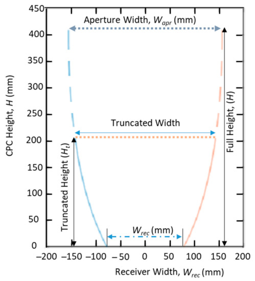 In this study, an analysis was performed to investigate the relationship between the percentage of original height to be truncated, the resulting height left after truncation, reduction in aperture width, and geometric concentration ratio with truncation. It was observed that the 40–60% upper portion of the full height of CPC could be truncated without much decrement in the aperture width and concentration ratio. The concentrator designed during the present study was truncated to 50% of its original height, as shown in Figure 4. The design parameters of the CPC, before and after truncation, are summarized in Table 1.