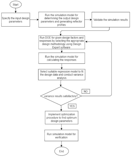 RSM is a blend of mathematical and statistical approaches used to explore the interrelationship amongst various independent variables and response variable(s) [39]. The applications of RSM are found in different research areas for experimental design, modeling, and optimization of multi-variate systems [40,41,42]. Originally RSM was developed to model experimental responses, but later it was also used for modeling simulation-based systems [43,44]. It is also used in design optimization problems due to its simplicity, accuracy, and improved convergence characteristics [45]. In optimization problems, the main goal of RSM is to optimize the response variables by evaluating different combinations of independent variables based on a chain of experimental designs. In RSM, the correlation between factors and responses of the given system may be expressed by linear or quadratic regression models, depending upon the nature of experimental/simulation data. A three-level fractional factorial design approach, known as face-centered central composite design (FCCCD), was employed to establish the functional correlation between design factors and responses for the geometric optimization of CPC. Equation (16) describes the model used for optimization of design parameters.