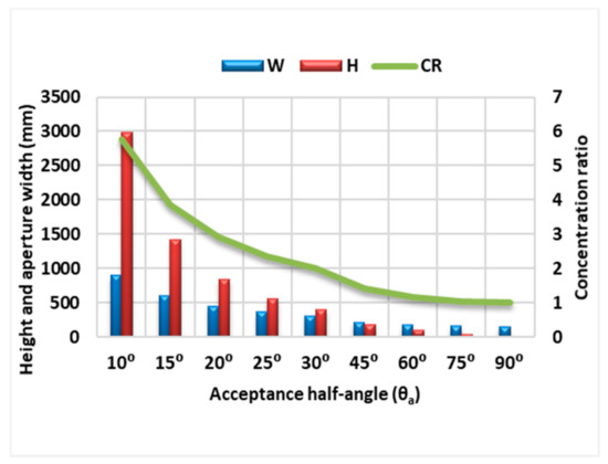 Height, aperture width and CR versus acceptance half-angle of CPC.