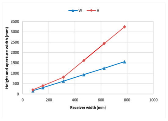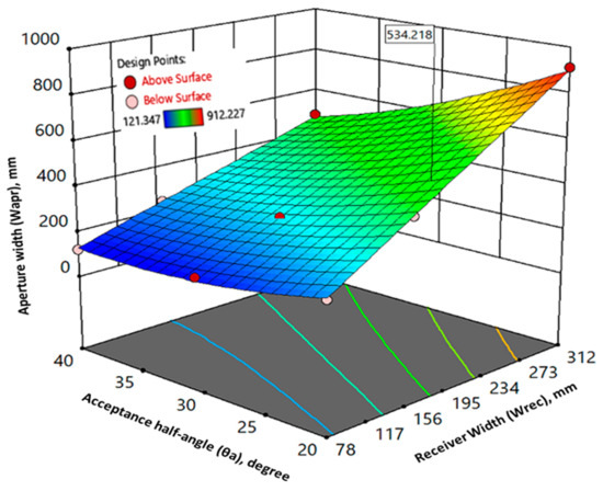 The synergistic effect of acceptance half-angle and receiver width on the aperture width is shown in Figure 16. The aperture width decreases with increasing acceptance half-angle. However, the amount of decrement is lesser as compared to that of height. When the receiver width increases, the aperture width follows the same pattern. According to specified optimization conditions, the optimum value of the aperture width is evaluated to be 534.218 mm.