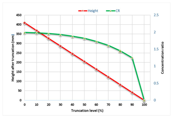 The variation of geometric CR and CPC height with increasing truncation level percentage is shown in Figure 8. Increasing truncation level results in reduced CPC height, thus achieving desirable material conservation. As a result, the cost to be incurred upon CPC manufacturing can be reduced significantly without sacrificing the geometric CR substantially. As depicted in Figure 8 the CR remains the same until the 30% truncation level, which means that 30% of top reflector portions can be removed without causing a reduction in the CR of the concentrator. There is a slight decrease in CR up to a truncation level of 50%. As the truncation level increases beyond 50%, the corresponding value of CR starts decreasing at a faster rate while still maintaining its value above 1.5 at 80% truncation level. Finally, beyond 90% truncation level, CR drops steeply to zero value. Similar results were reported in the literature [13] for 2D CPC with the thermal absorber.