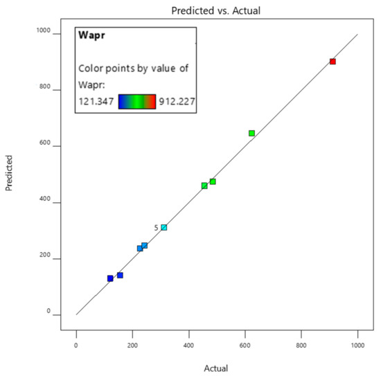 Besides fit statistics, the diagnostic plots offer an alternate option for validating the models by graphically depicting the adequacy and normal distribution of the model statistical data. Figure 9 shows graphically the actual and predicted values for response 1 (Wapr). The predicted and actual values for the concerned response, as depicted by the graph, are in close agreement with each other.