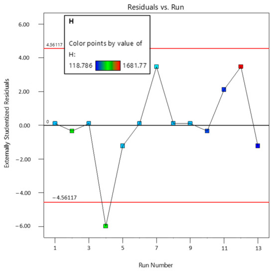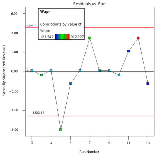 Figure 10 shows the graph of run order versus externally studentized residuals. The distribution of data points along the run order suggests that there is no significant increase or decrease in the values predicted by the model. Only a single point lies outside of the lower critical value line, which has no noticeable effect on the performance of the selected model.