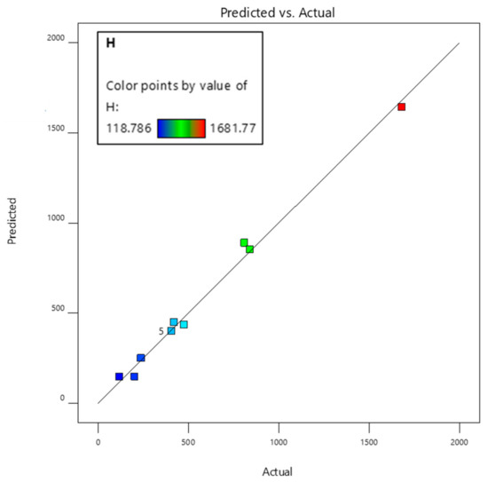 The fit statistical data for the second response, i.e., height (H), is given in Table 4. The values of R2, adjusted R2, and predicted R2 and adequate precision are 0.99, 0.98, 0.91, and 48.84, respectively, which indicates that the selected model for predicting the values of the height parameter is significant. The minute difference between predicted R2 and actual R2 confirms the adequacy of the chosen model. The higher value of adequate precision ensures that the model has a signal sufficient to be used in optimization.