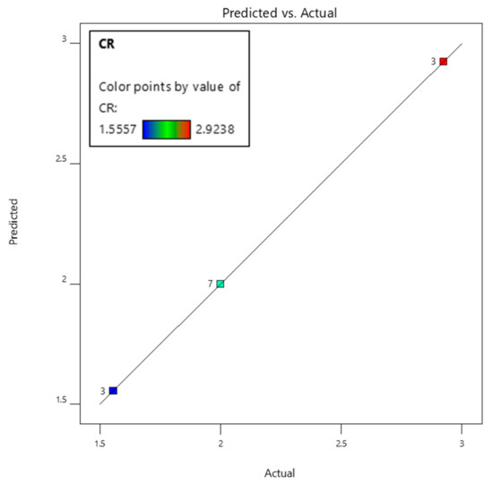 Figure 13 shows the plot of actual and predicted values for response 3 viz. concentration ratio (CR). This graph aims to expose the values that are not easily predicted by the selected model, but no such values are found in this case. As shown in Figure 13, the predicted and actual values for CR are closely related, thus validating the model.