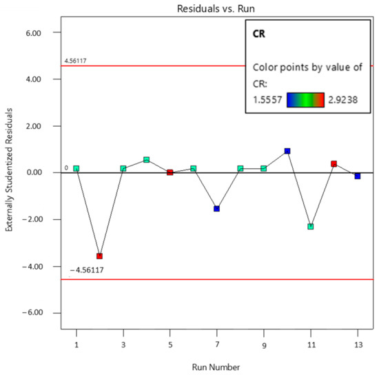 The run order plot for response 3 (CR) is displayed in Figure 14. The distribution of data points along the run order suggests that there is no significant increase or decrease in the values predicted by the model. Most of the values are in close proximity to the central line with random scattering. No specific pattern of residuals above and below the central line is observable, in this case, which leads to the conclusion that the run order of the design process has no significant influence on the data.