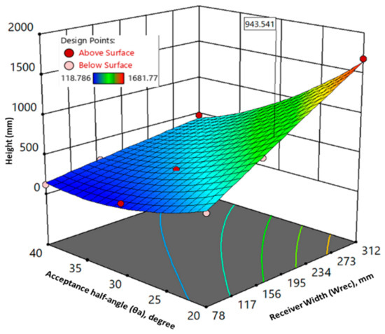 The interrelationship between the factors and the responses in RSM is best described by surface plots. A three-dimensional surface plot shows the functional relationship between the designated dependent variable and the corresponding two independent variables. The response surface plot showing the combined effects of variation of acceptance half-angle and receiver width on the height of CPC is shown in Figure 15.
