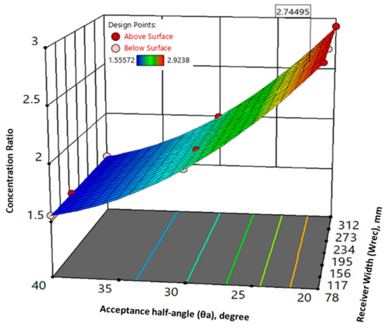 It depicts the combined effect of variation of acceptance angle and receiver width on the resulting CPC height. As the acceptance half-angle increases, the height decreases to lower values. On the other side, as the aperture width increases, the height of CPC increases too. A trade-off between two conflicting outcomes of the response parameter can be found using the response surface modeling approach. As demonstrated in Figure 6, the optimum value of CPC height turns out to be 943.54 mm.