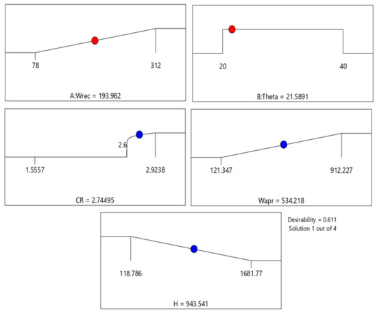 In the present study, RSM was used for model building and subsequent geometric optimization of CPC, intended for PV applications. The receiver width and acceptance half-angle were selected as the independent design parameters, whereas concentration ratio, aperture width, and height of CPC were adopted as the response variables. The lower and upper levels for both input parameters were specified. The lower and upper levels for half acceptance angle were bound to be 20° and 40°, whereas the receiver width was altered in the range of 78 to 312 mm. During the optimization process, the independent factors were set to vary within the specified range. The optimization criteria for two responses viz. concentration ratio and aperture width were selected to be maximum, whereas CPC height was set to be minimal while carrying out the optimization. The optimization criteria, as well as lower and upper limits of design parameters, are specified in Table 2.