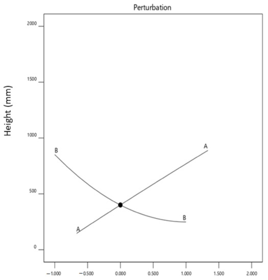 The slope of the design factor “A” indicates the direct relationship between factor “A” and its corresponding response. The design factor “B” has a negative gradient, as shown in Figure 20, which confirms its inverse relationship with the relevant factor. The design factor “B” has a profound effect on the height compared to the design factor “A”.